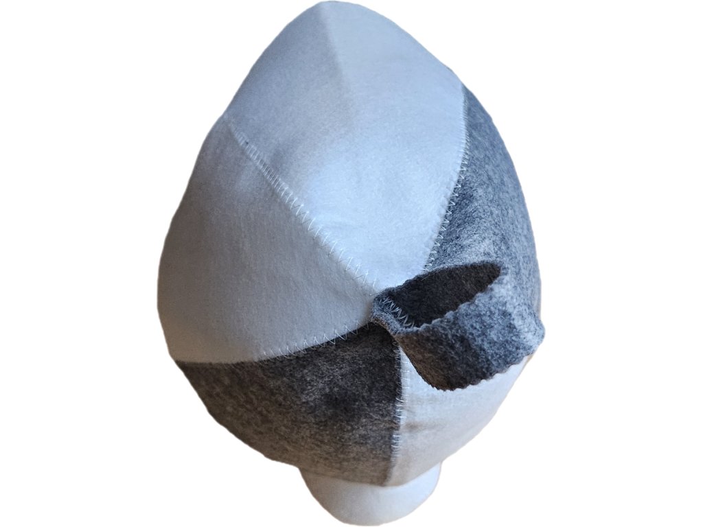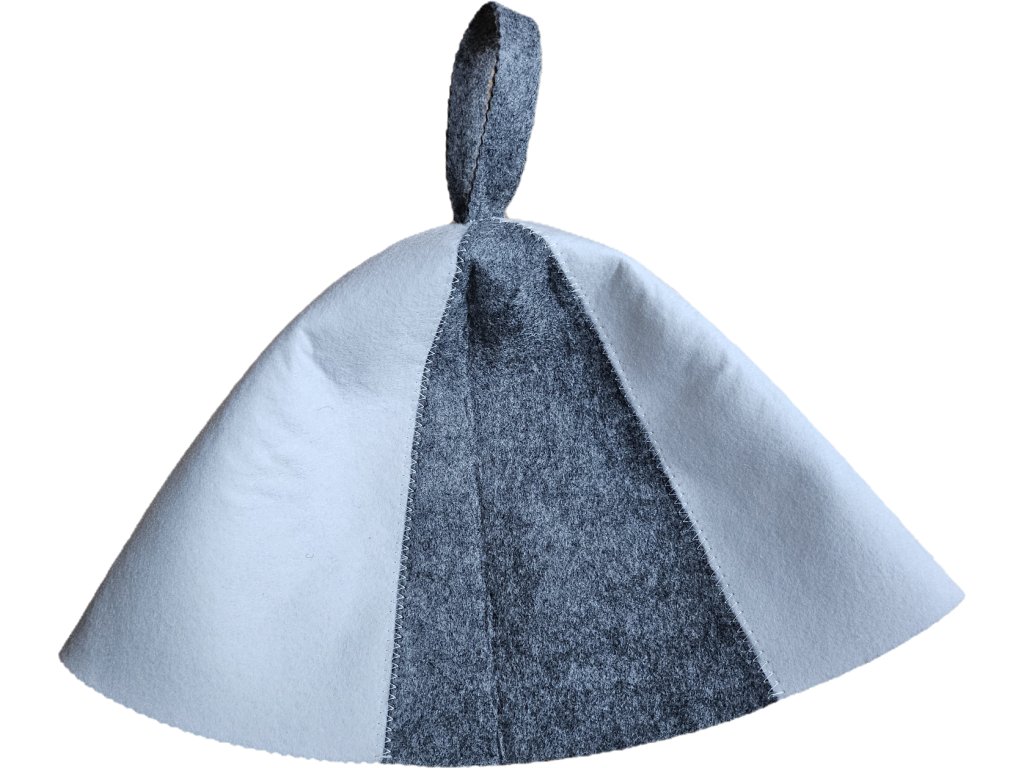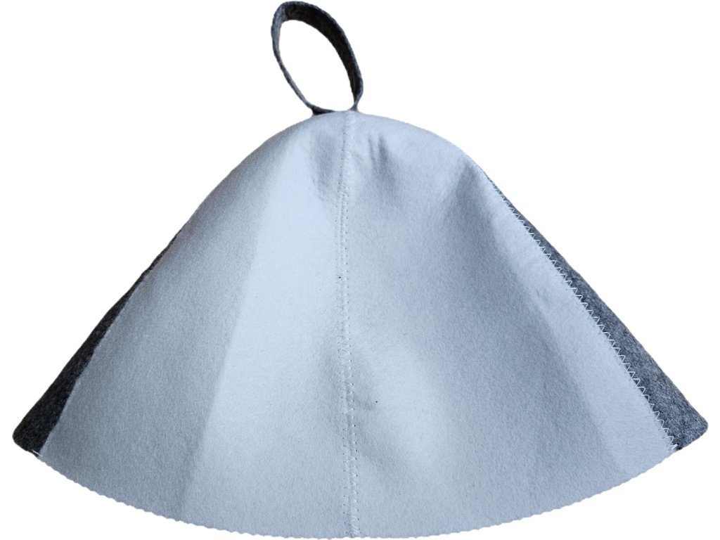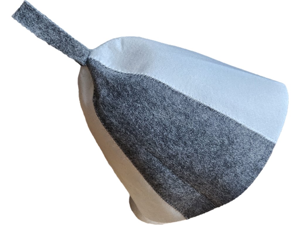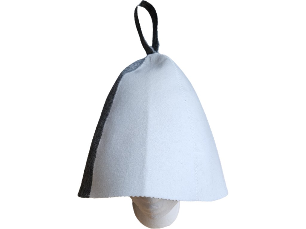 Kvalitní klobouk do sauny dvojbarevný v šedobílé barvě s poutkem na zavěšení je vyroben ze směsi vlny a polyesteru.