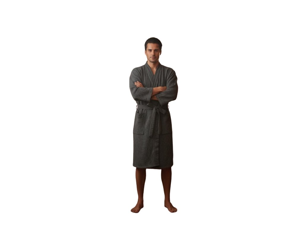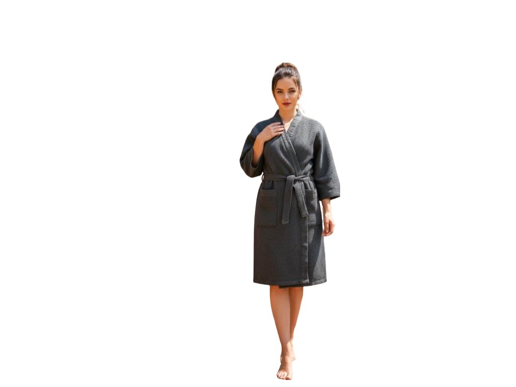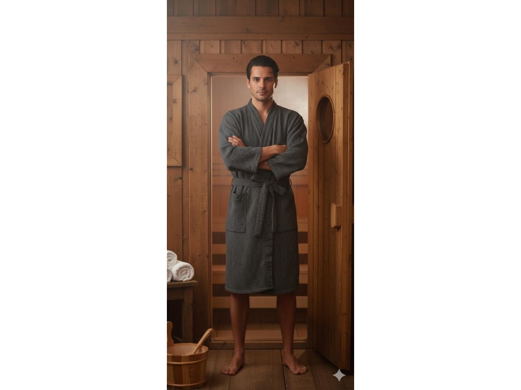 Pohodlný saunový župan s lemováním a páskem na zavazování.